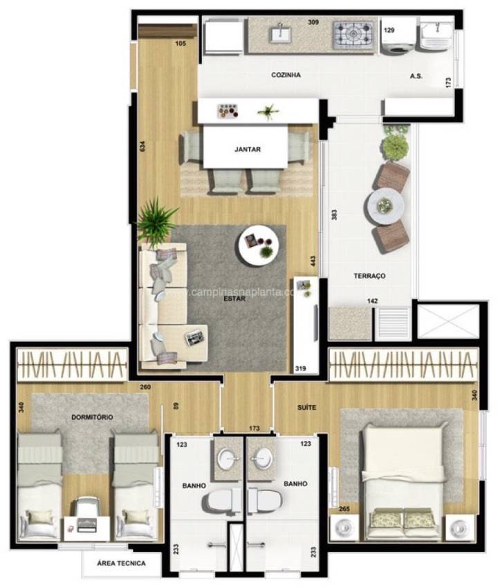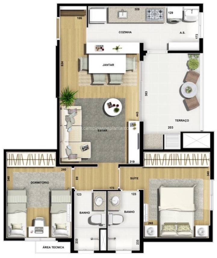 - Área técnica exclusiva para instalação da unidade condensadora do sistema de ar-condicionado split (exceto nas plantas de 74m² do 1º andar com sacada na suíte).