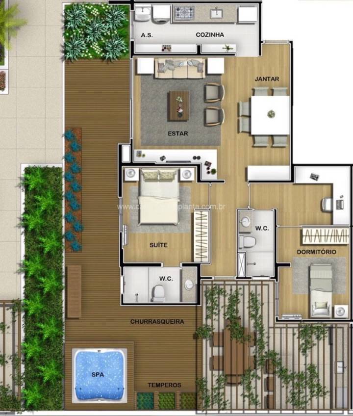 - Varandas gourmet entregues com churrasqueira e acesso direto pela cozinha em todos os apartamentos, evitando ter que tirar as roupas do varal no dia do churrasco ou ter que atravessar a sala com alimentos, trazendo mais praticidade para o seu dia a dia.