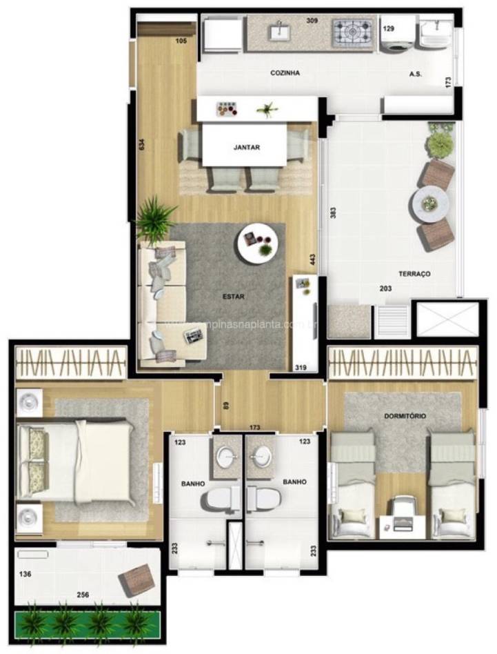 - Portas de correr de 3 folhas na varanda permitindo melhor integração com o Living e aproveitamento da iluminação e ventilação naturais.