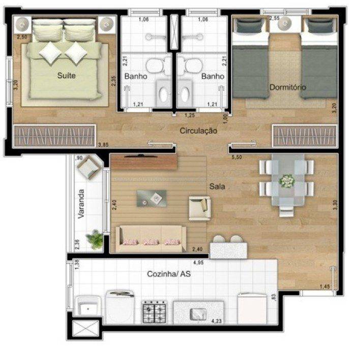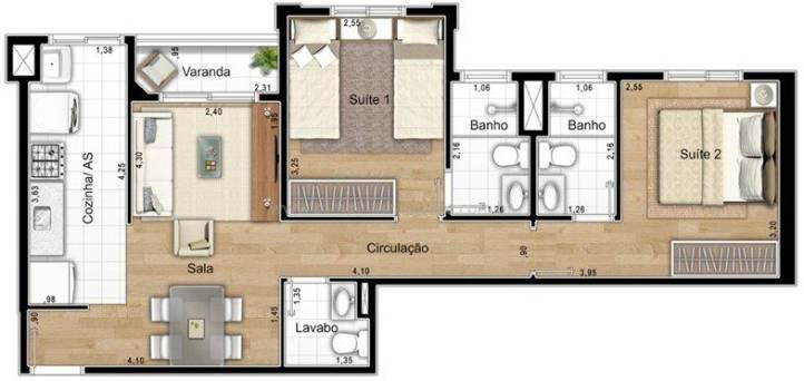 - Banheiros com iluminação e ventilação naturais (exceto pelo lavabo da planta de 57m²).