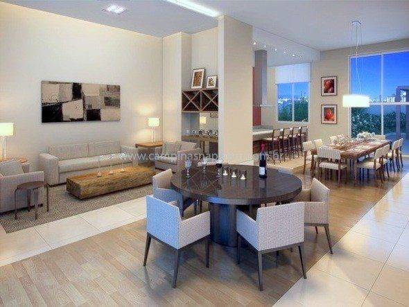 - Cozinha integrada à sala com bancada para refeições e preparação para cooktop.