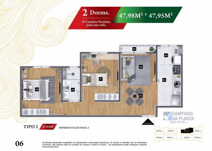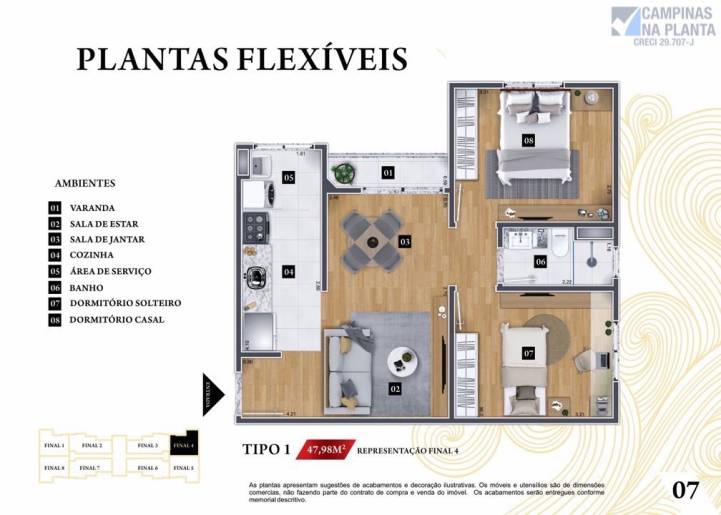 - Duas opções de planta flexíveis, 47,98m² (canto) e 47,95m² (meio).