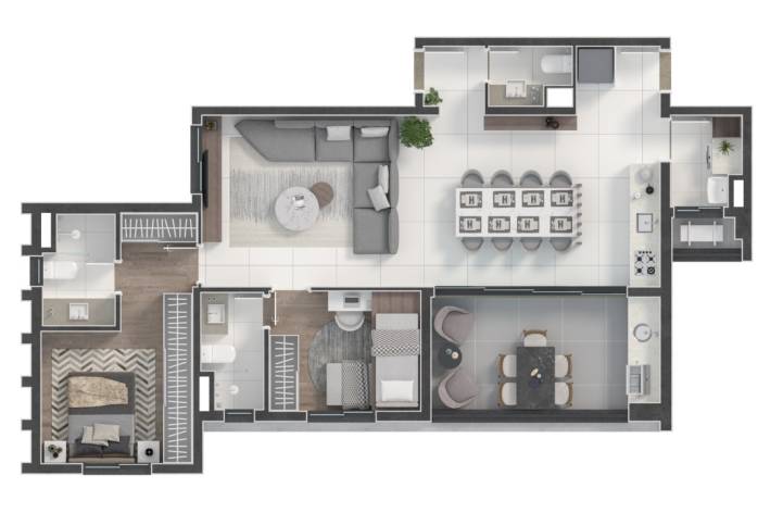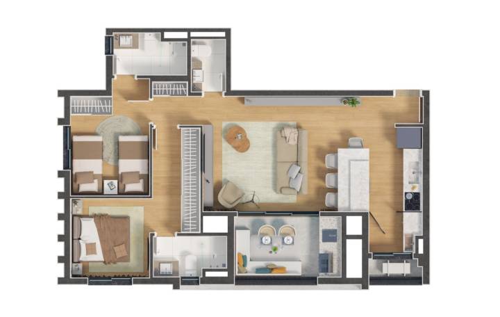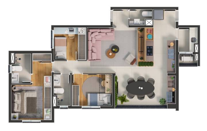 - Acabamentos: Pisos em porcelanato nas áreas frias (cozinha, banheiros, terraço) e contrapiso nos dormitórios e sala, permitindo total personalização.